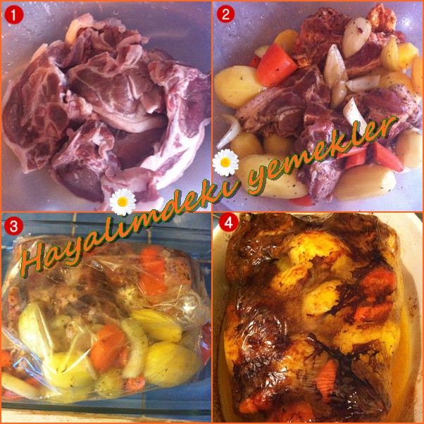 Kemikli kuzu eti (ben dilimli satılan , haşlamalık kuzu eti kullandım ) sosu için: Öncelikle etler tuz, yağ ve baharatlarla marine edilir. Şifa deposu 23 tarif #1 fırında haşlama et ilepatates.